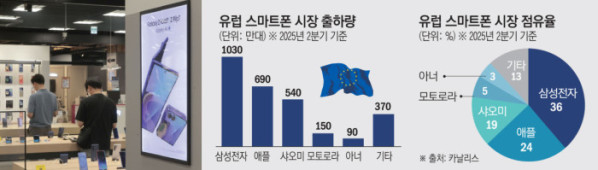 유럽 스마트폰 시장이 올해 2분 한 자릿수대 역성장을 기록하며 글로벌 최악의 성적표를 받아들었지만, 삼성전자가 선두 자리를 지켜냈다. 에코디자인(Eco-design) 규제 시행으로 일부 모델이 판매되지 못했음에도 출하량 1000만 대 이상을 유지하며 압도적 1위를 이어갔다.