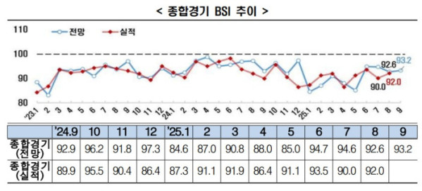 9월 조사 부문별 BSI는 모두 부정적으로 전망됐다. 내수(91.7)·수출(92.6)·투자(90.6)는 지난해 7월 이후 1년 3개월 연속 동반 부진이 이어졌다.