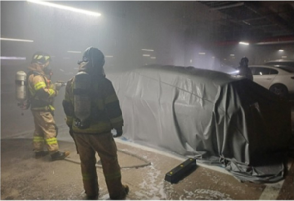 1000℃ 이상 고열에서도 견딜 수 있는 전기자동차 화재 발생 때 '질식소화덮개'가 주목을 받고 있다.