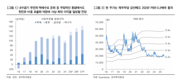 다만 리스크도 있다. 최 연구원은 “물류 업종 전반이 경기 둔화와 규제 리스크로 투자심리가 약한 상황”이라며 “특히 노란봉투법 관련 노조 이슈는 한진에도 부담 요인”이라고 짚었다. 이어 “내년부터 현금흐름 개선이 본격화될 것으로 예상된다”며 “2025년 예상 PBR이 0.2배 수준에 불과해 이익 가시성만 확보된다면 재평가 여지가 크다”고 덧붙였다.