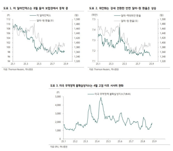 원·달러 환율은 8월 한 달 동안 1380~1400원대의 좁은 박스권에 갇혀 뚜렷한 방향성을 찾지 못하고 있다. 미국의 무역정책 불확실성이 완화되고 미 달러와 위안화 모두 안정세를 보였음에도 불구하고 환율이 높은 수준을 유지한 배경에는 국내 수급 요인이 결정적으로 작용했다는 분석이다.