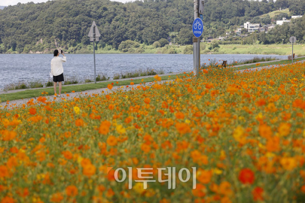 서울 낮 최고기온이 31도를 기록하며 폭염주의보가 발효 중인 29일 경기 남양주 한강공원 삼패지구에 가을을 재촉하는 코스모스가 활짝 피어있다. 고이란 기자 photoeran@