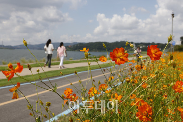 ▲서울 낮 최고기온이 31도를 기록하며 폭염주의보가 발효 중인 29일 경기 남양주 한강공원 삼패지구에 가을을 재촉하는 코스모스가 활짝 피어있다. 고이란 기자 photoeran@