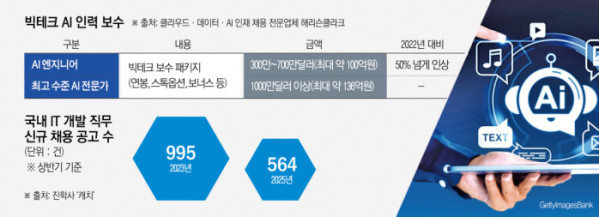반면 최상위급 수준의 개발 능력을 보유한 이들의 몸값은 천정부지로 오르는 상황이다. 클라우드·데이터·AI 인재 채용 전문업체 해리슨클라크에 따르면 AI 엔지니어의 일반적인 빅테크 보수 패키지 즉 연봉과 스톡옵션, 보너스 등을 포함한 보수 수준은 300만∼700만 달러(최대 약 100억 원)로 2022년 대비 50%나 올랐다. 최고 수준 AI 전문가의 보수는 1000만 달러(약 136억 원)도 넘는다.