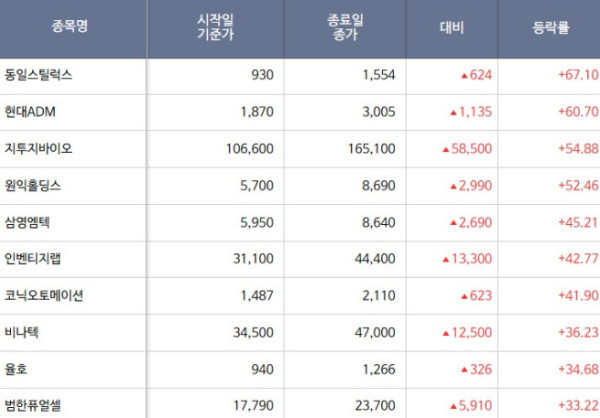 이외에도 원익홀딩스(52.46%), 삼영엠텍(45.21%), 인벤티지랩(42.77%), 코닉오토메이션(41.90%), 비나텍(36.23%) 등이 상승률 상위권을 차지했다.