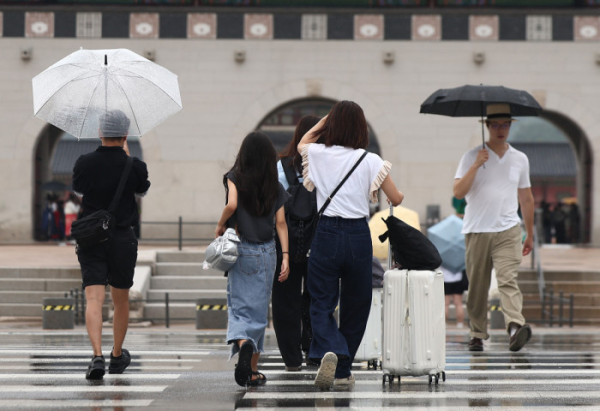 ▲소나기가 내린 25일 오전 서울 종로구 광화문 인근에서 외국인 관광객이 비를 피하고 있다. (사진제공=연합뉴스)