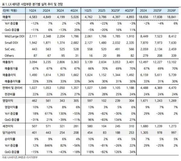 LX세미콘의 2분기 실적은 매출액 3786억 원, 영업이익 102억 원으로 시장 기대치를 크게 하회했다. 정 연구원은 “계절적 비수기 영향으로 주력 고객사인 LG디스플레이의 아이폰향 P-OLED 패널 출하량이 감소했고, 주요 TV, IT 세트 업체들이 미국의 상호관세 정책을 대비해 전분기에 선행적으로 재고를 확보한 기저효과로 중국 패널 고객사들의 출하량이 줄면서 DDI 수요가 둔화됐기 때문”이라고 분석했다.