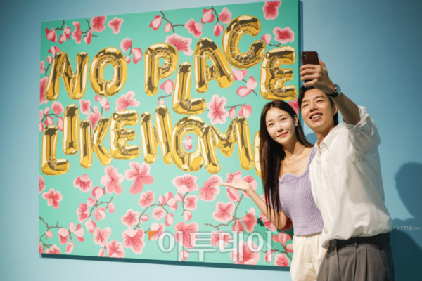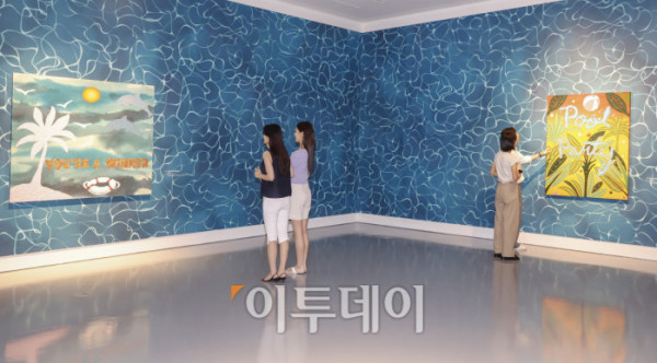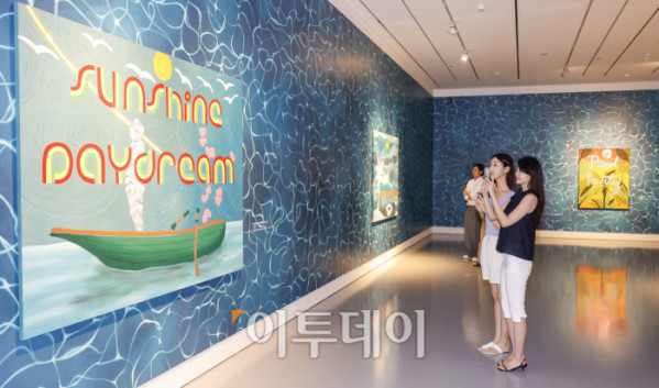 ▲1일 인천 중구 파라다이스시티 아트스페이스에서 열린 미국 팝아트 작가 조엘 메슬러의 국내 첫 개인전 파라다이스 파운드(Paradise Found) 사전공개 행사에서 관람객들이 전시를 관람하고 있다. 파라다이스시티는 2일부터 치유와 회복의 메시지를 트로피컬한 색채와 경쾌한 화풍으로 담아낸 조엘 메슬러의 작품 24점을 선보인다. 조현호 기자 hyunho@