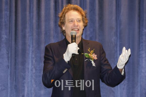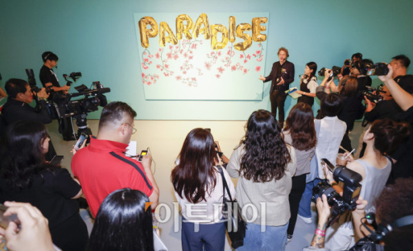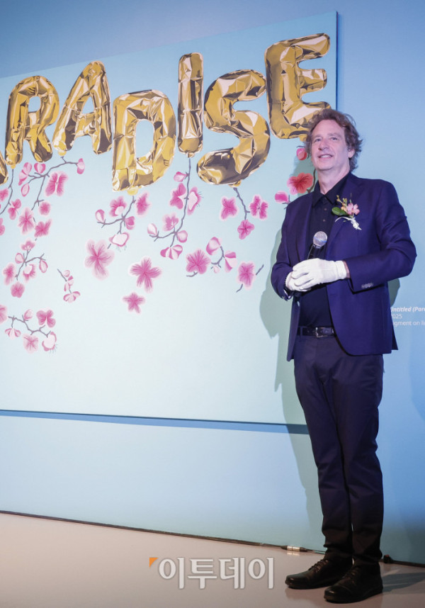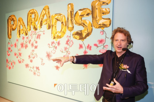 ▲미국 팝아트 작가 조엘 메슬러가 1일 인천 중구 파라다이스시티 아트스페이스에서 열린 국내 첫 개인전 파라다이스 파운드(Paradise Found) 사전공개 행사에서 작품 '파라다이스 위드 블로섬스(Paradise with Blossoms)'를 소개하고 있다. 파라다이스시티는 2일부터 치유와 회복의 메시지를 트로피컬한 색채와 경쾌한 화풍으로 담아낸 조엘 메슬러의 작품 24점을 선보인다. 조현호 기자 hyunho@
