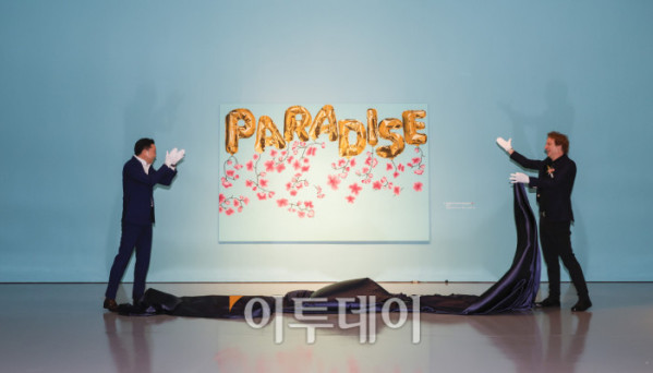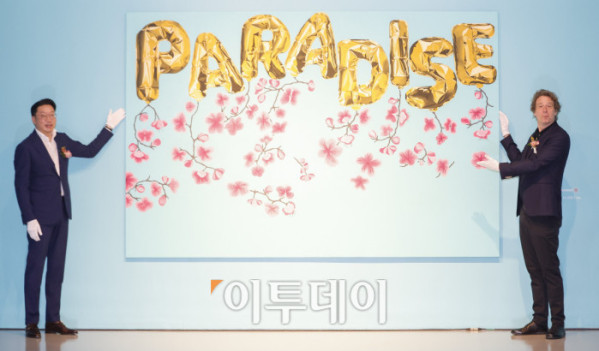▲미국 팝아트 작가 조엘 메슬러(오른쪽)와 최종환 파라다이스 대표이사가 1일 인천 중구 파라다이스시티 아트스페이스에서 열린 국내 첫 개인전 파라다이스 파운드(Paradise Found) 사전공개 행사에서 작품 '파라다이스 위드 블로섬스(Paradise with Blossoms)'를 소개하고 있다. 파라다이스시티는 2일부터 치유와 회복의 메시지를 트로피컬한 색채와 경쾌한 화풍으로 담아낸 조엘 메슬러의 작품 24점을 선보인다. 조현호 기자 hyunho@