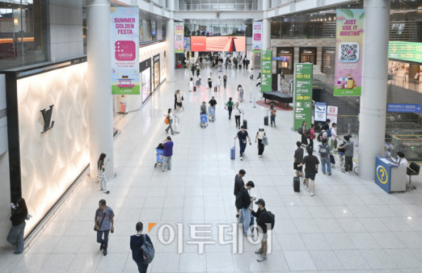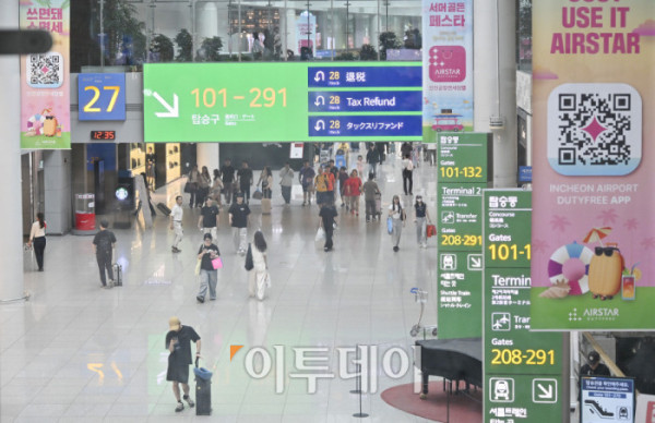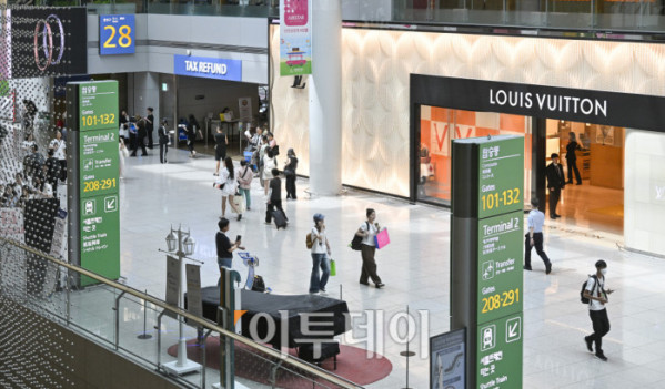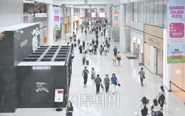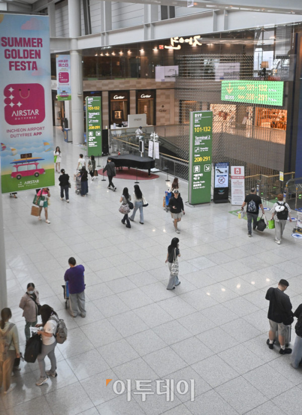 최근 전 세계에서 K 콘텐츠가 인기를 끌면서 한국을 찾는 관광객이 큰 폭으로 늘고 있으나 면세점 업황은 회복 기미를 보이지 않고 있다. 1일 한국면세점협회와 업계에 따르면 7월 면세점 매출액은 9199억4652만원으로, 작년 7월 1조65억268만원보다 8.6% 줄었다. 같은 기간 구매 인원이 236만3113명에서 258만339명으로 9.2% 증가한 것과 상반된다. 7월 한국을 찾은 외국인 관광객은 작년 동기보다 23.1% 늘었고 면세점에서 물품을 구매한 외국인 수도 관광객 수 증가폭과 비슷하게 25.1% 늘었으나 구매액은 오히려 14.2% 감소했다. 이날 인천국제공항 제1여객터미널 면세구역에서 이용객들이 발걸음을 옮기고 있다. 조현호 기자 hyunho@