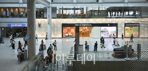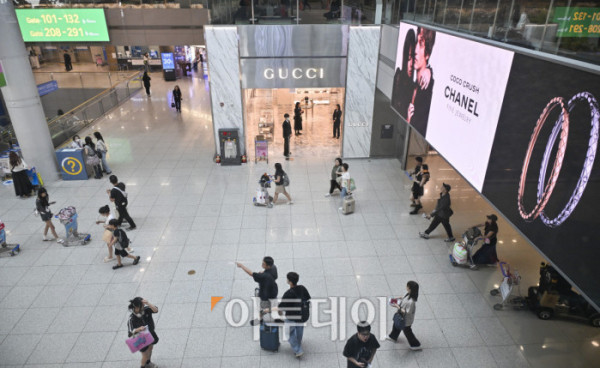 ▲최근 전 세계에서 K 콘텐츠가 인기를 끌면서 한국을 찾는 관광객이 큰 폭으로 늘고 있으나 면세점 업황은 회복 기미를 보이지 않고 있다. 1일 한국면세점협회와 업계에 따르면 7월 면세점 매출액은 9199억4652만원으로, 작년 7월 1조65억268만원보다 8.6% 줄었다. 같은 기간 구매 인원이 236만3113명에서 258만339명으로 9.2% 증가한 것과 상반된다. 7월 한국을 찾은 외국인 관광객은 작년 동기보다 23.1% 늘었고 면세점에서 물품을 구매한 외국인 수도 관광객 수 증가폭과 비슷하게 25.1% 늘었으나 구매액은 오히려 14.2% 감소했다. 이날 인천국제공항 제1여객터미널 면세구역에서 이용객들이 발걸음을 옮기고 있다. 조현호 기자 hyunho@