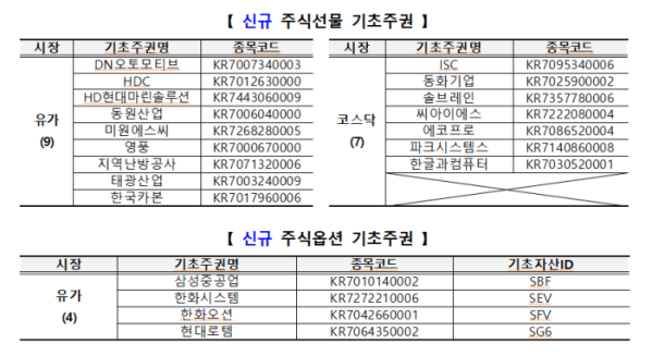 주식선물 기초주권에는 유가증권시장에서 DN오토모티브, HDC, HD현대마린솔루션 등 9개 종목이, 코스닥시장에서 ISC, 동화기업, 솔브레인 등 7개 종목이 각각 상장된다.