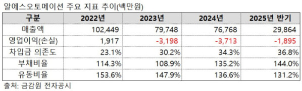 알에스오토메이션은 2022년 매출 1024억 원, 영업이익 19억 원에서 이듬해부터 매출은 700억 원대로 줄었고 30억 원대 적자가 이어졌다. 올해 상반기에는 매출이 299억 원으로 작년 같은 기간보다 9.7% 줄었고 영업손실 19억 원으로 적자가 지속했다. 재무 안정성 측면에선 부채비율이 2022년 114.3%에서 올해 상반기 144.0%로 올라갔고 유동비율은 153.6%에서 131.2%로 낮아졌다.