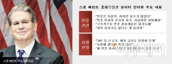 스콧 베선트 미국 재무장관은 1일(현지시간) 로이터통신과 인터뷰에서 "연준은 독립적이어야 하고, 독립적이다"라면서도 "그러나 그들이 많은 실수를 저질렀다고 생각한다"고 지적했다.