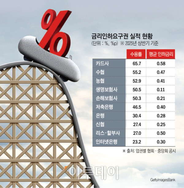 업권별로 △은행(수용률 30.4%, 금리인하 폭 0.28%포인트) △생명보험(50.5%, 0.11%) △손해보험(50.3%, 0.21%) △카드(65.7%, 0.58%), △저축은행(46.5%, 0.40%) △농협(52.9%, 0.41%) △수협(55.2%, 0.47%) 등이었다. 수용률 하위 3개 업권은 △신협(27.4%, 0.25%) △리스·할부금융사(27.0%, 0.50%) △인터넷전문은행(23.2%, 0.30%)이었다. 금리인하요구 신청 4건 중 3건가량이 거절된 셈이다.