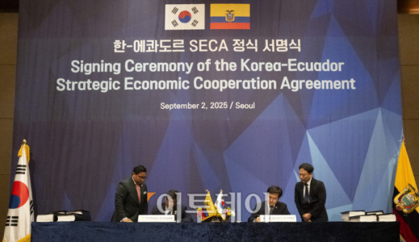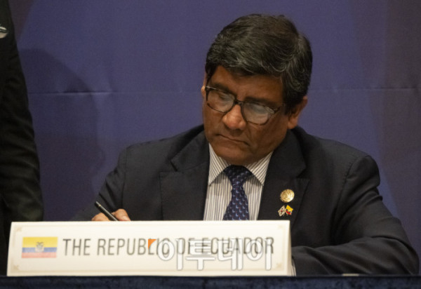 ▲루이스 알베르토 하라미요 에콰도르 생산통상투자수산부 장관이 2일 서울 중구 롯데호텔에서 열린 한-에콰도르 전략적경제협력협정(SECA) 정식 서명식에서 협정문에 서명을 하고 있다. 조현호 기자 hyunho@