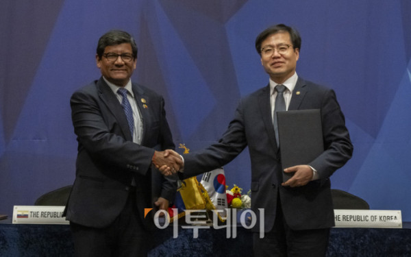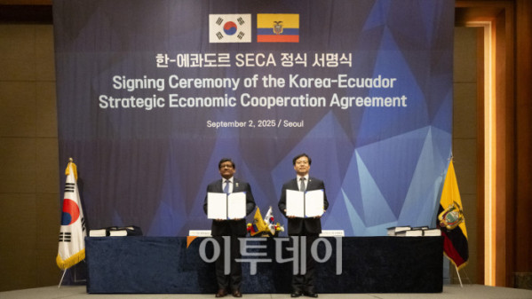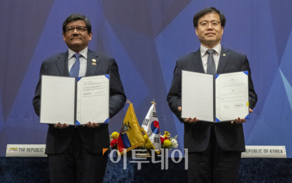 여한구(오른쪽) 산업통상자원부 통상교섭본부장과 루이스 알베르토 하라미요 에콰도르 생산통상투자수산부 장관이 2일 서울 중구 롯데호텔에서 열린 한-에콰도르 전략적경제협력협정(SECA) 정식 서명식에서 협정문에 서명을 마친 후 기념촬영을 하고 있다. 조현호 기자 hyunho@