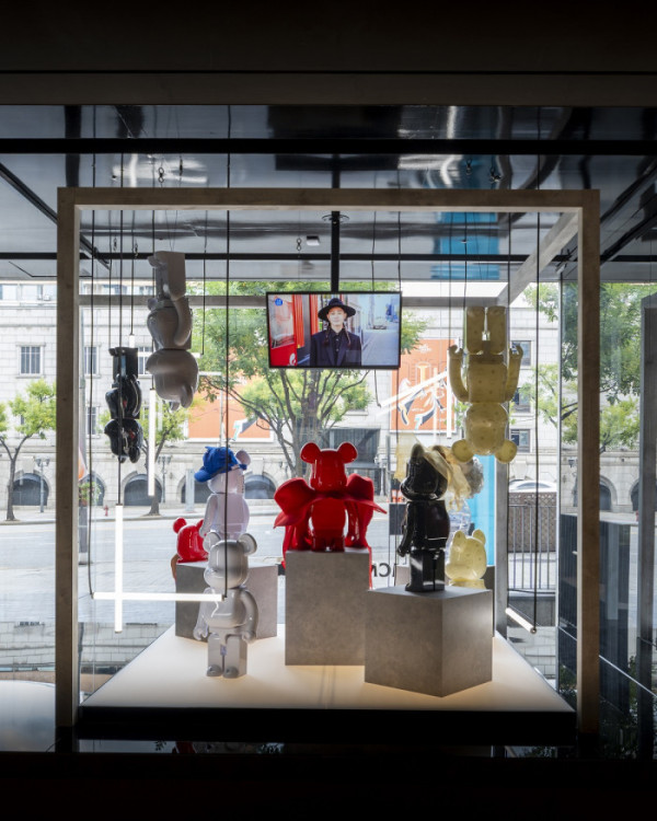 1층엔 노부키 히즈메가 베어브릭 위에 오트 쿠튀르 기법으로 완성한 아방가르드 모자가 얹어진 윈도우 디스플레이 설치 작품이 자리했다. 그는 프랑스에서 아시아인으로는 처음으로 인간 문화재 칭호를 받은 자타공인 모자 거장으로 통한다.