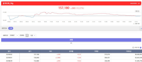 국내 금값은 지난달 29일 g당 15만2860원이었으나 이후 사흘 만에 4320원이 오르며 단기간 강세 흐름을 이어갔다. 이날 거래량은 57만5974g, 거래대금은 약 904억 원에 달했다.