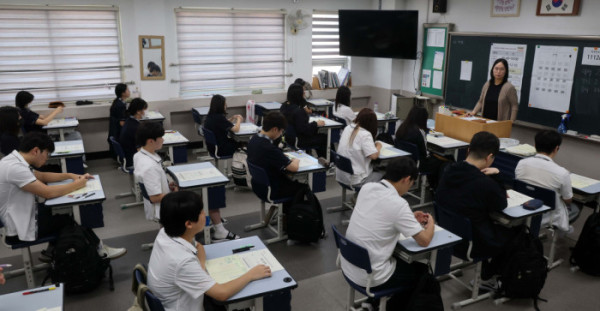 ▲2026학년도 대학수학능력시험 모의평가가 실시된 3일 서울 광진구 광남고에서 고3 학생들이 시험 준비를 하고 있다. 사진공동취재단