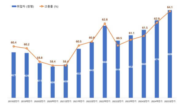 ▲수원시는 2018년부터 2025년까지 반기별 취업자 수와 고용률이 전반적으로 증가세를 보여왔으며, 2025년 상반기에 역대 최고 고용률을 기록했다. (수원특례시)