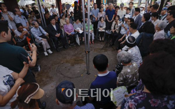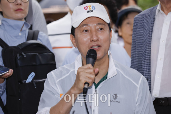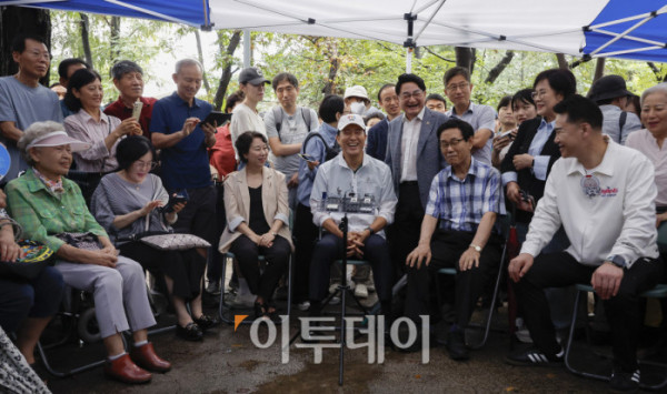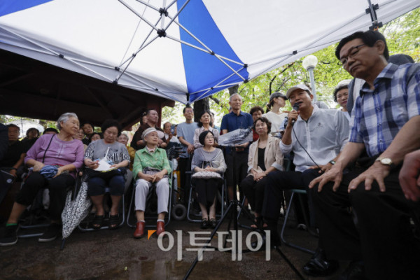 ▲오세훈 서울시장이 4일 재건축사업 현장점검을 위해 서울 도봉구 삼환도봉아파트를 찾아 주민들과 간담회를 하고 있다. 조현호 기자 hyunho@