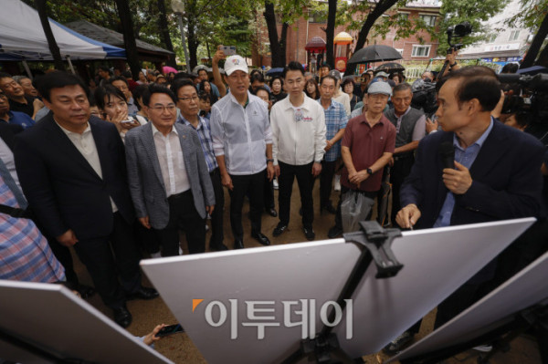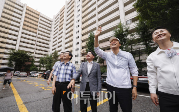 ▲오세훈 서울시장이 4일 재건축사업 현장점검을 위해 서울 도봉구 삼환도봉아파트를 찾아 현장점검을 하고 있다. 조현호 기자 hyunho@