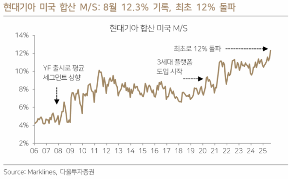 다올투자증권 보고서에 따르면 현대차와 기아의 8월 미국 판매량은 각각 전년 동기 대비 11.3%, 10.9%를 기록해 +2.4%인 시장 대비 크게 성장했다. 합산 M/S는 12.3%를 기록해 역사적 수치에 도달했다. 포드의 M/S 12.7%와도 격차가 좁혀져, 3위 자동차 브랜드로 도약이 임박했다. 2026년도는 미국 모멘텀이 순수전기차(EV) 판매가 강한 유럽으로도 확산을 기대된다.