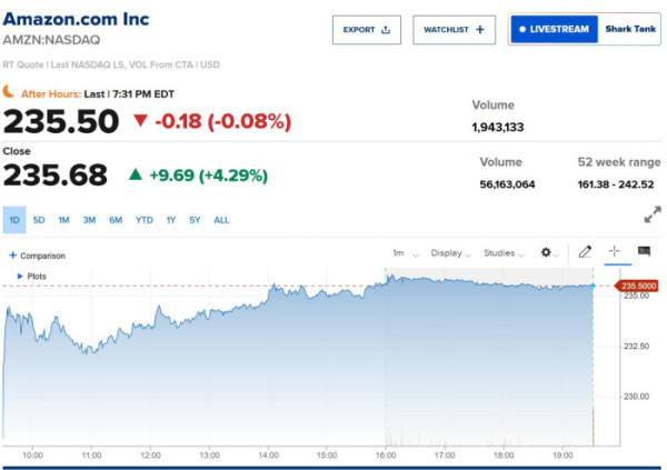 이날 아마존 주가는 전일 대비 4.29% 상승한 235.68달러에 장을 마감했다.