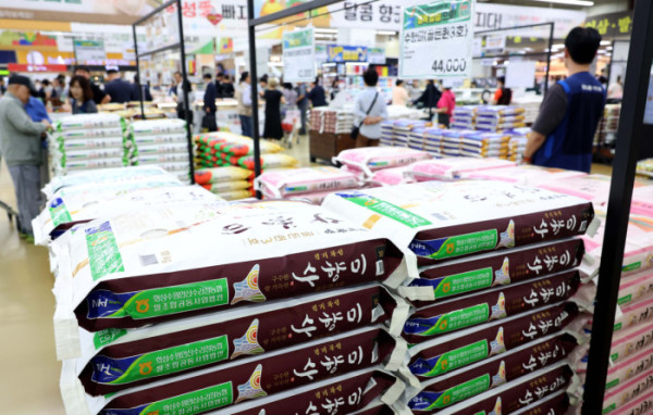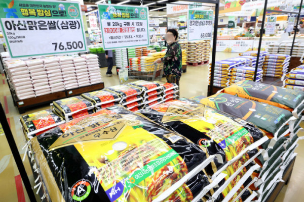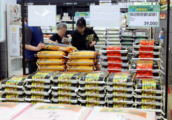 쌀 소비자 가격이 급등하자 농림축산식품부는 5일 가공용 쌀을 추가 공급하고 지난달 1일부터 진행중인 쌀 할인행사 단가를 11일부터 20㎏ 당 3000원에서 5000원으로 늘린다고 밝혔다. 이날 서울의 한 대형마트에서 시민들이 쌀을 살펴보고 있다. 추석을 목전에 두고 쌀값이 지난해 대비 17% 오르며 심리적 저항선인 20kg에 6만 원 선을 넘었다. 이상기후로 생산량이 감소한 영향에 정부 공급 제한 정책까지 맞물린 까닭이다.