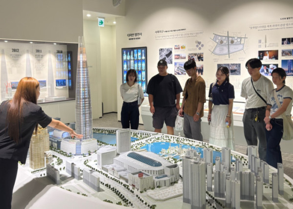 ▲일본 오사카경제대 학생들이 4일 잠실 롯데월드타워를 찾아 신격호 롯데 창업주의 기업가 정신을 배웠다. 신격호 기념관을 방문한 학생들이 롯데월드타워, 롯데월드 어드벤처 등 롯데를 상징하는 건물들에 대한 설명을 듣고 있다. (사진제공=롯데지주)