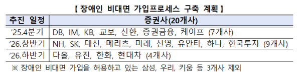 이번 조치는 증권사 창구 방문이 어려운 취약계층의 불편을 해소하기 위해 추진됐다. 현재 비대면종합저축 계좌를 취급하는 증권사 23곳 가운데 삼성·우리·키움증권 등 3곳만 비대면 가입이 가능하며, 나머지 20개사는 영업점 방문을 요구하고 있다. 이에, 방문에 어려움을 겪는 장애인 계좌 비중은 전체 39만8000개 계좌 가운데 3만2000개(8.1%)에 불과하다.
