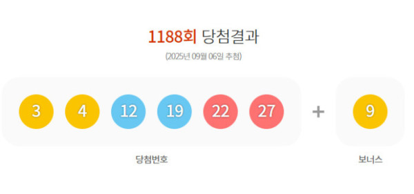 6일 동행복권에 따르면 1188회 로또복권 1등 당첨번호는 ‘3, 4, 12, 19, 22, 27’로 보너스 번호는 ‘9’이다.