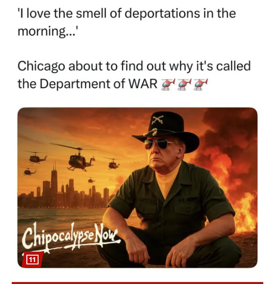 아울러 “나는 아침 추방의 냄새를 사랑한다”는 문구와 더불어 최근 국방부 명칭을 ‘전쟁부’로 바꾸는 행정명령을 내린 것을 상기하면서 “시카고는 이제 ‘전쟁부’라고 불리는지 알게 될 것”이라는 문구를 사진과 함께 게시했다.