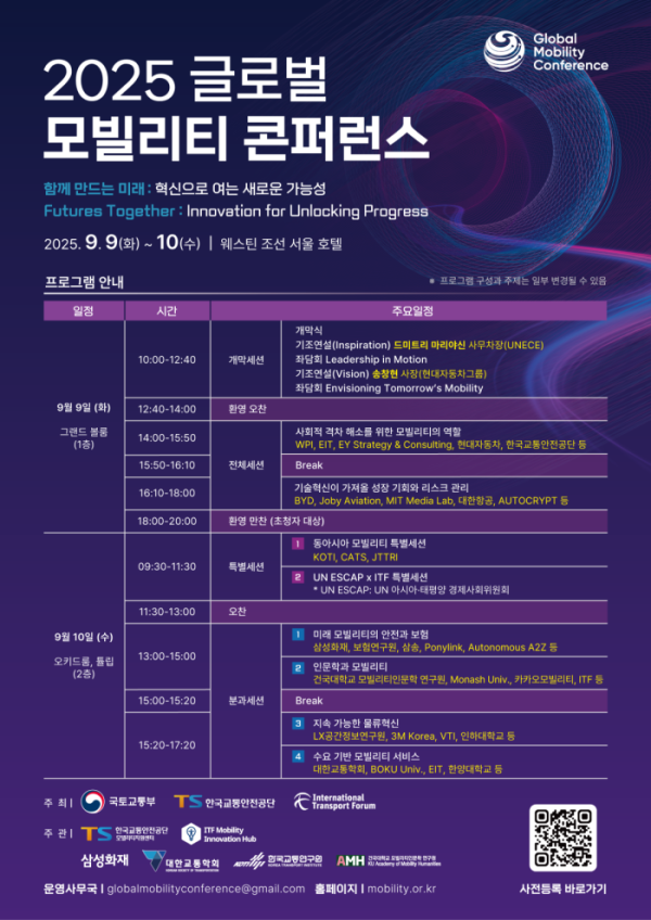 특히 이번 콘퍼런스에서는 현대차, 삼성화재, BYD, JOBY, 3M 등 글로벌 민간기업 및 EIT(유럽혁신기술연구소), WPI(우스터공과대학), CATS(중국 교통운수부과학연구원), JTTRI(일본 운수종합연구소), MIT 등 세계 주요 연구기관들과 함께 UNECE, UN ESCAP, 아시아개발은행(ADB) 등 다양한 국제기구가 한자리에 모여 모빌리티의 정책 방향과 비전에 대해 심도 있는 논의를 한다는 데 의미가 크다.