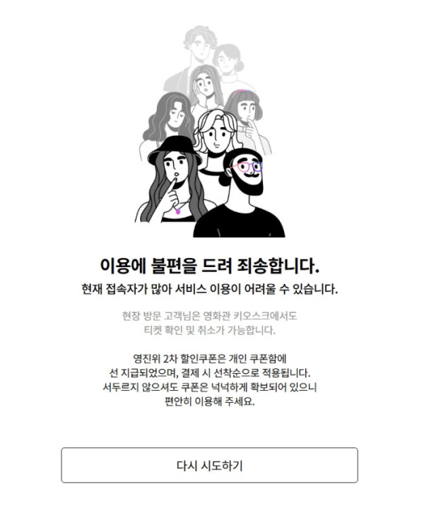 정부가 8일 오전 10시부터 영화 입장권 6000원 2차 할인 쿠폰 188만 장을 선착순 배포하자 롯데시네마 홈페이지에 접속자가 몰리며 장애가 발생했다. CGV의 경우 1500명 가량 접속 대기가 있었다. 이번 물량은 7월 25일 1차 배포된 450만 장 가운데 이달 2일까지 사용되지 않은 잔여분이다. 이번 2차 배포는 1차와 달리 결제 시 선착순 자동 적용 방식으로 운영된다. CGV·롯데시네마·메가박스 등 각 영화관의 온라인 회원 쿠폰함에 1인당 2매씩 자동 지급되며 예매 시 결제 단계에서 별도 입력 없이 자동으로 6000원 할인이 적용된다.