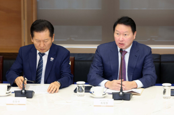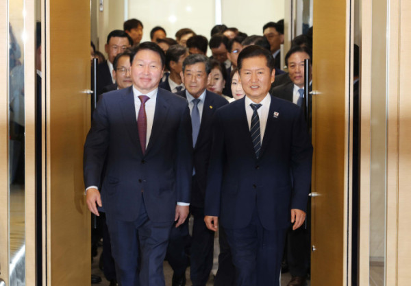 ▲최태원 대한상공회의소 회장이 8일 서울 중구 대한상공회의소에서 열린 ‘더불어민주당-대한상공회의소 정책간담회’에서 인사말을 하고 있다. 신태현 기자 holjjak@