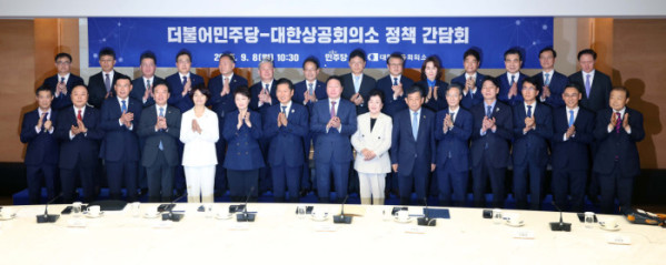정청래 더불어민주당 대표와 최태원 대한상공회의소 회장 등이 참석한 가운데 8일 서울 중구 대한상공회의소에서 ‘더불어민주당-대한상공회의소 정책간담회’가 열렸다.