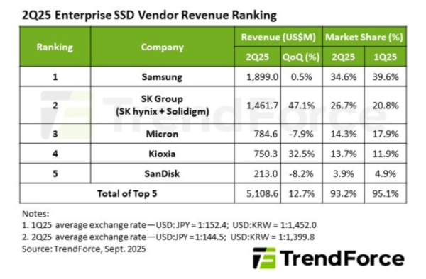 8일 시장조사업체 트렌드포스에 따르면 SK그룹(SK하이닉스+솔리다임)의 2분기 엔터프라이즈 SSD 매출은 14억6170만 달러(약 2조 원)로 전분기 대비 47.1% 증가했다. 그룹 역사상 최대 분기 매출이다. 같은 기간 글로벌 상위 5개 업체 전체 매출은 51억 달러 규모로 12.7% 증가했는데, SK하이닉스의 성장세는 이 평균을 압도했다.