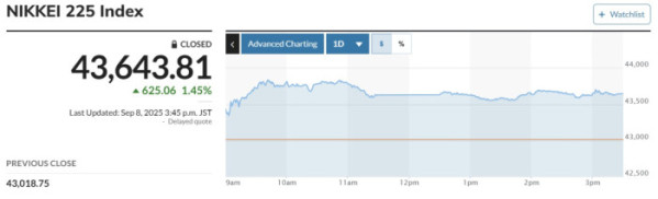 마켓워치에 따르면 일본증시 닛케이225(닛케이)는 전날보다 625.06포인트(1.45%) 오른 4만3643.81로 마감했다. 기술주 중심의 토픽스도 32.89포인트(1.06%) 올라 3138.20에 마감했다.