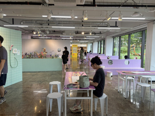 ▲경기상상캠퍼스에서 관람객들이 연한 파란색과 보라색 타일로 꾸며진 전시 공간 내 테이블에서 활동을 하고 있다. (경기문화재단)