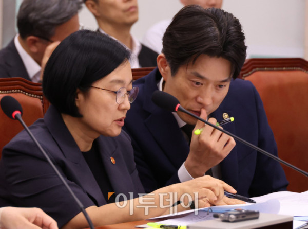▲한성숙(왼쪽) 중소벤처기업부 장관과 노용석 차관이 8일 서울 여의도 국회 산업통상자원중소벤처기업위원회 전체회의에서 대화하고 있다. 고이란 기자 photoeran@