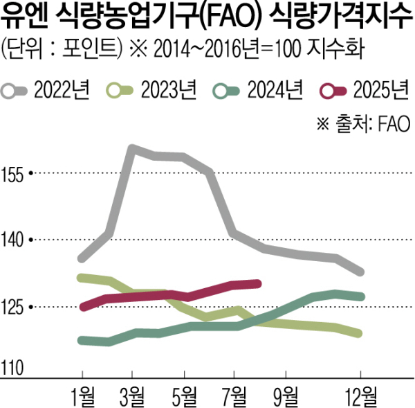 8일 유엔 식량농업기구(FAO) 자료를 살펴보면 8월 식량가격지수는 130.1포인트를 기록했다. 전년 동월 대비 6.9% 상승한 것으로, 2023년 2월 이후 2년여 만에 최고치를 경신했다. 러시아가 우크라이나를 침공하며 정점을 찍었던 2022년 3월보다는 18.8% 낮지만, 여전히 높은 수준을 이어가고 있다.