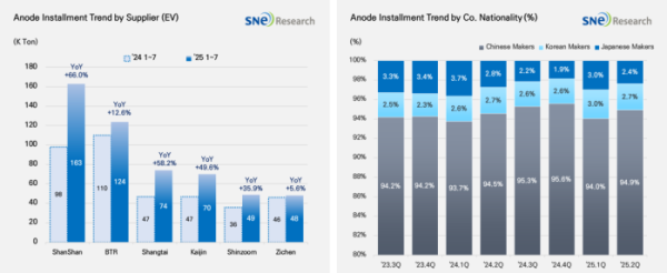 업체별로는 중국 샨샨(16만3000t)과 BTR(12만4000t)이 각각 1·2위를 차지하며 글로벌 시장을 견인했다. 두 회사는 CATL, BYD, LG에너지솔루션 등 주요 배터리 제조사에 음극재를 공급하며 안정적인 고객 기반과 대규모 생산 역량을 동시에 확보했다는 평가를 받는다.