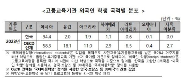 외국인 학생 국적별 분포를 살펴보면, 아시아 국적을 가진 유학생 비율이 94.4%로 OECD 평균(58.3%)을 크게 웃돌았다. 유럽(2.0%), 아프리카(1.9%), 북아메리카(1.1%), 라틴아메리카(0.6%), 오세아니아(0.1%) 등이 뒤를 이었다.