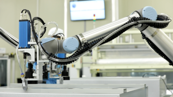 ▲제조 공장에서 산업용 로봇 팔이 생산 관련 작업을 수행하고 있다. (경기테크노파크)