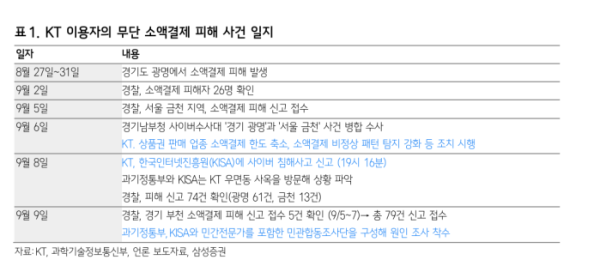 최민하 삼성증권 연구원은 10일 “KT 이용자들을 중심으로 특정 지역에서 무단 소액결제 피해가 발생해 한국인터넷진흥원(KISA)에 사이버 침해 사실을 신고한 상태”라며 “정확한 범행 수법과 피해 경로가 규명되지 않은 상황에서 보안 리스크가 부각되고 있다”고 분석했다.