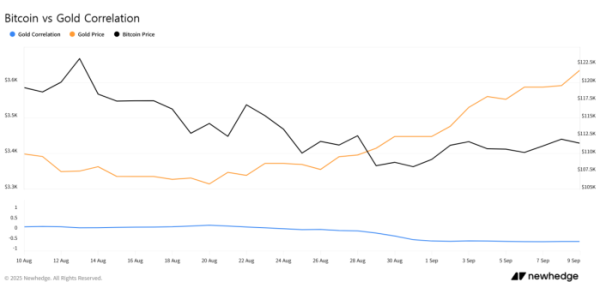 10일 블록체인 분석 플랫폼 뉴헤지(Newhedge)에 따르면 9일 기준 금과 비트코인의 30일 이동 상관계수는 -0.5437을 기록했다. 지난달 말부터 음수로 전환한 뒤 이달 들어서는 줄곧 -0.5대를 유지하고 있다. 상관계수는 -1에서 +1까지 분포하며, 1에 가까울수록 양의 상관관계가 강하다는 뜻이다.