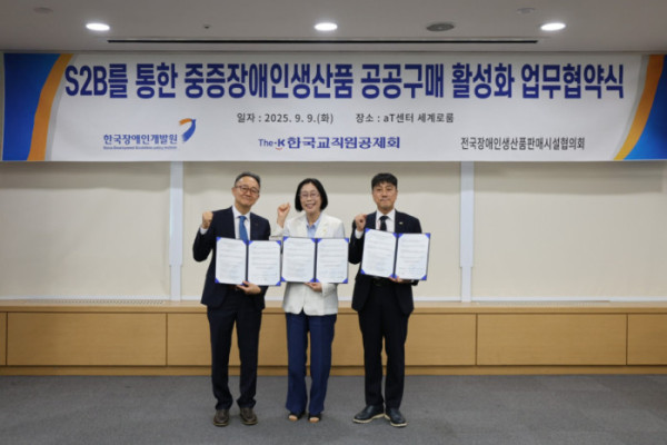 이상목 한국교직원공제회 S2B사업대표는 “이번 협약은 단순한 조달 연계를 넘어 장애인생산시설이 공공시장에서 정당한 경쟁력을 가질 수 있도록 돕는 기반을 마련한 것”이라며, “앞으로도 공공 플랫폼으로서 S2B가 사회적 가치 실현의 중심 역할을 수행할 수 있도록 협력체계를 지속적으로 확대하겠다”고 밝혔다.